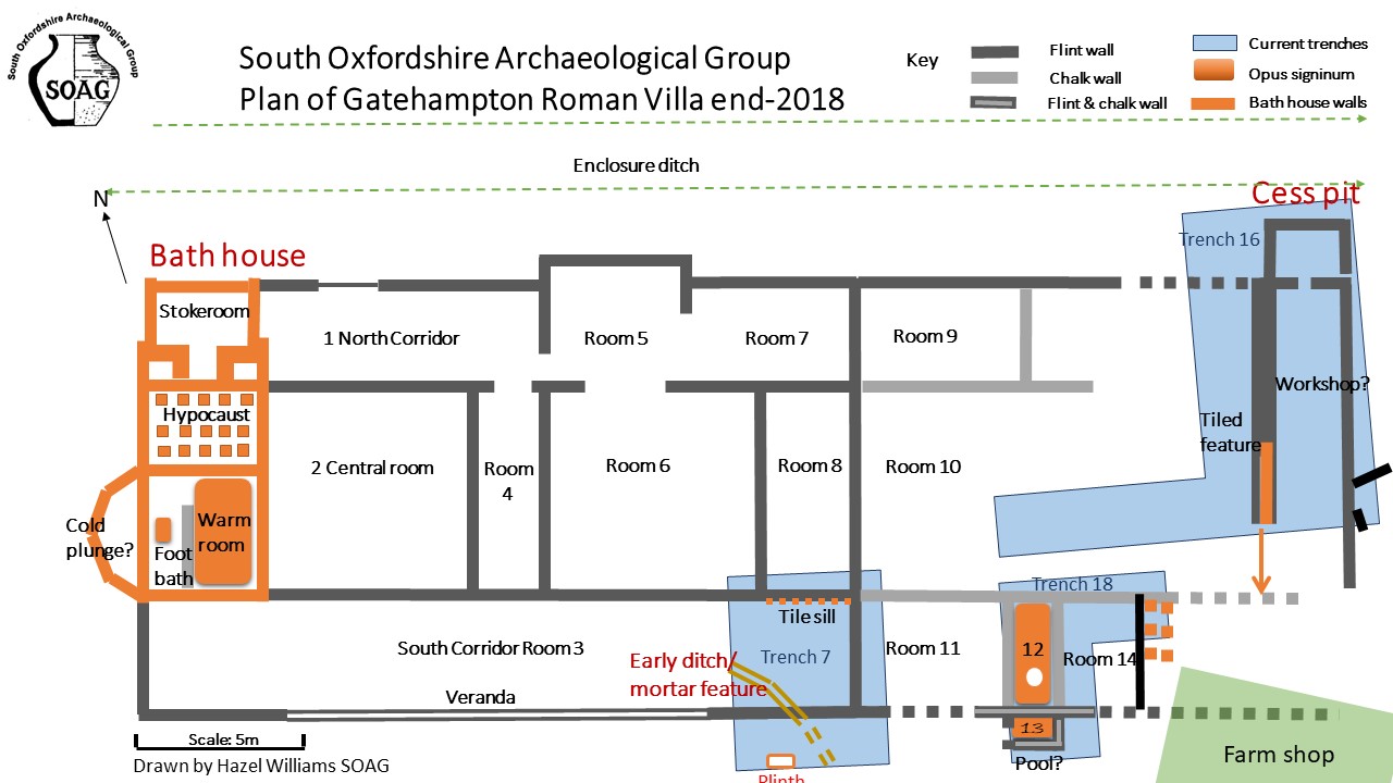 SOAG volunteers assisted on the excavation of a nearby pipeline route in the 1980s. This produced evidence of occupation from early post-glacial to the Bronze Age and again in the Roman and Saxon periods. A Roman corndrier was discovered and the trackways and enclosures of a Roman farmstead, probably set out in the 2nd century. SOAG began a programme of fieldwalking to locate the villa building. After some trial trenches, phase 1 of the excavation began at the eastern end of the site, over a linear feature in the field where the landowner said his plough often caught on large flints. A boundary ditch and the flint wall of the villa building was discovered. The ditch was filled with Roman material; roof tiles, building rubble, painted wall plaster, pottery, bone and other artefacts, including a small bronze trinket ring with a pale green glass bezel. This part of the villa building was a working area with many small furnaces and hearths, one with evidence of metalworking. The most interesting find was a large iron ladle, with a distinctive 'twisted' handle, found beneath the largest flint stone on the site. It must have been deliberately placed there, perhaps when the villa was abandoned. Phase 2 of the excavation began in 2000, with the opening up of trenches over the western end of the villa.